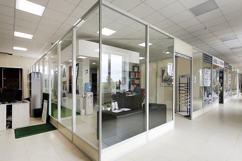 Безрамные стеклянные противопожарные перегородки могут изготавливаться как в полностью остекленном варианте, так и в частично остекленном исполнении. Основное предназначение таких конструкций — это разделение общего помещения на несколько отдельных рабочих зон. При этом преследуется несколько целей: